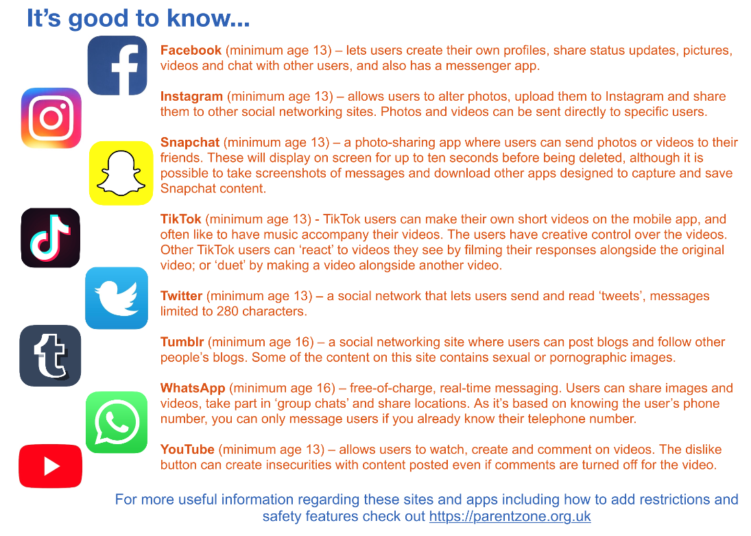 It has been brought to our attention that some of our children have Facebook, TikTok, WhatsApp and other social media profiles, even though the permitted minimum age to use these sites is 13 years old or more, according to their terms and conditions. Some misuse of these apps has led to children at our school becoming upset and learning time being lost as staff support children through these fallouts.