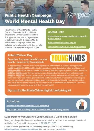 Please find attached a health & wellbeing newsletter for Warwickshire children, young people and families from the Warwickshire School Health and Wellbeing Service. There is also some information about World Mental Health Day, which takes place on Saturday (10th October) with the Young Minds ‘HelloYellow’ campaign taking place on Friday (9th October).