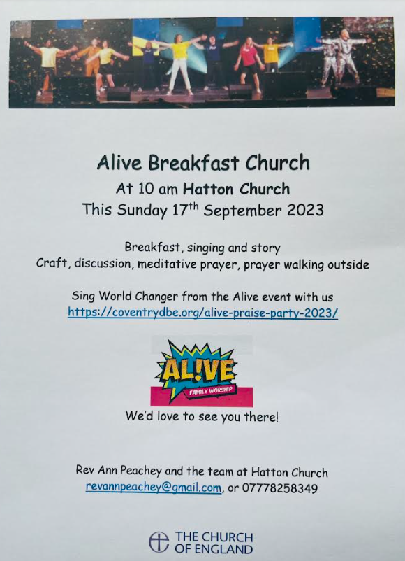 Alive Breakfast Church - Sunday 17th September at 10am at Hatton Church starts with breakfast and chat, followed by a short interactive time of singing, discussion, craft, creative prayer - suitable for all ages to come and have fun together.